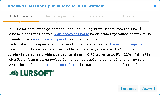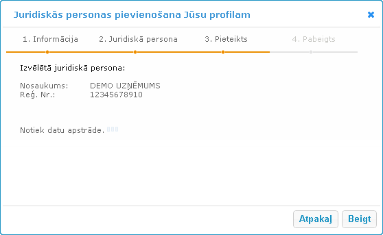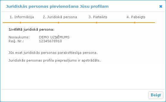 aprakstītas nākamās darbības juridiskās personas pievienošanai. Juridiskās personas konts Jūsu profilam tiks pievienots