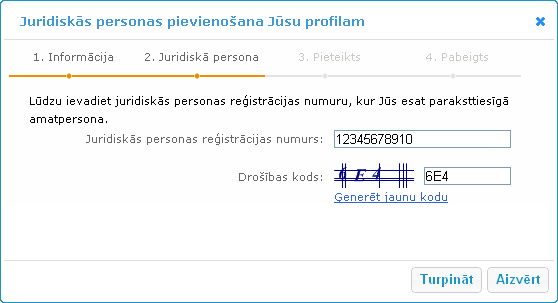 Nākamajā solī ir jāievada juridiskās personas reģistrācijas numurs, kurā lietotājs ir minēta