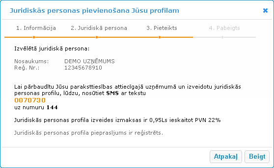 koda ievades jānospiež poga Nākamajā solī tiks attēlota Jūsu izvēlētā juridiskā persona