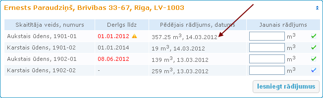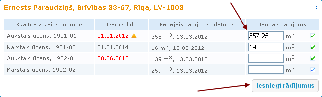skaitītājam kolonnā Jaunais rādījums ievada pareizo rādījumu un